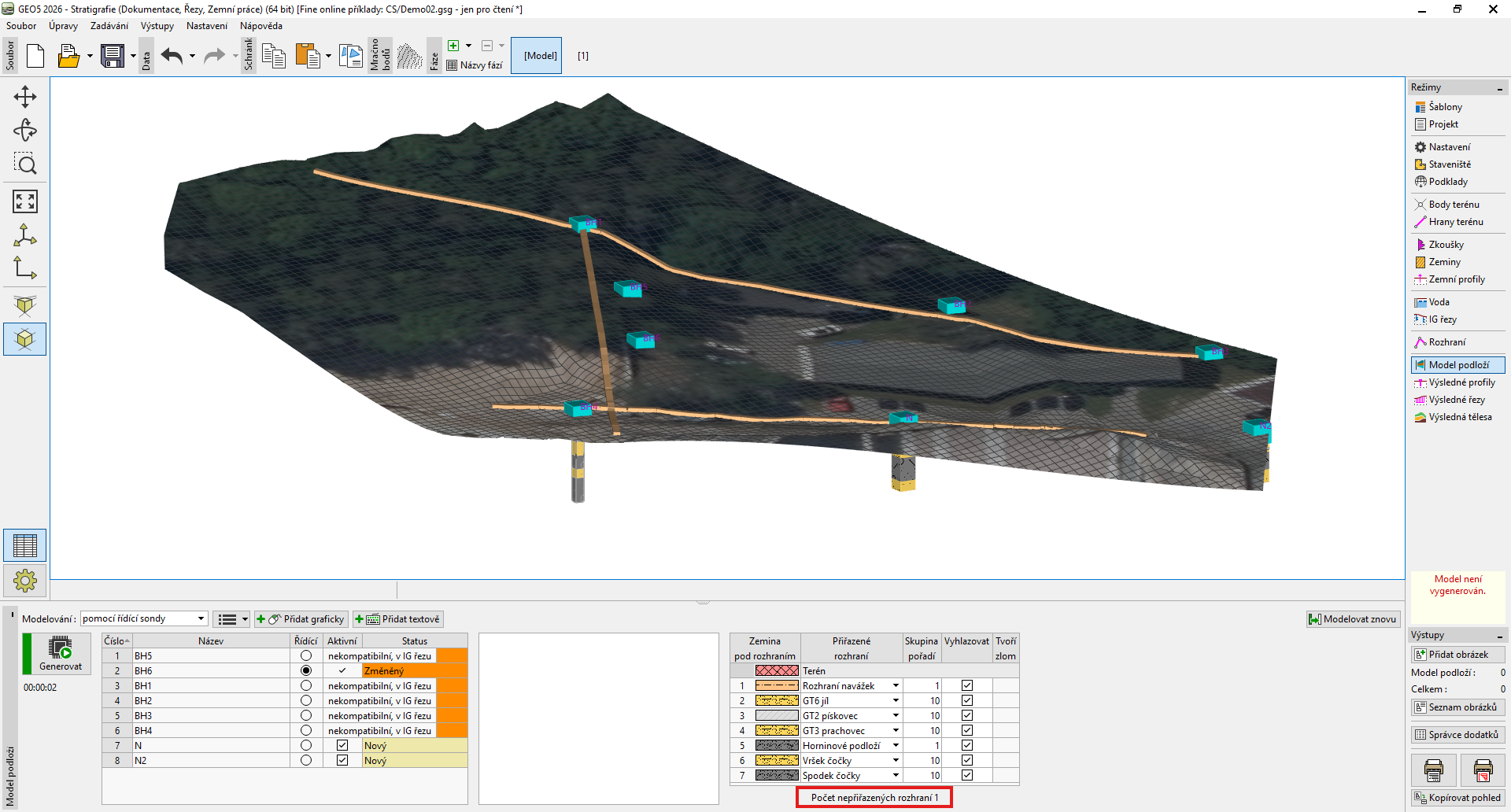 V tabulce vrstev přiřadíme příslušná rozhraní a určíme pořadí generace vrstev. Rozhraní určuje horní hranici zobrazené zeminy. Průběžná rozhraní musí být generována jako první, teprve poté se generují rozhraní, která se na průběžná rozhraní napojují - např. čočky.