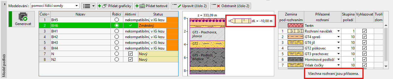 Pokud nejsou všechna námi definovaná rozhraní v tabulce vrstev zobrazena, upravíme řídící sondu a rozhraní do ní přidáme. Informace o počtu rozhraní nepřiřazených do modelu je zobrazena pod tabulkou vrstev. Po přiřazení rozhraní do tabulky se informace pod tabulkou změní na "Všechna rozhraní jsou přiřazena".