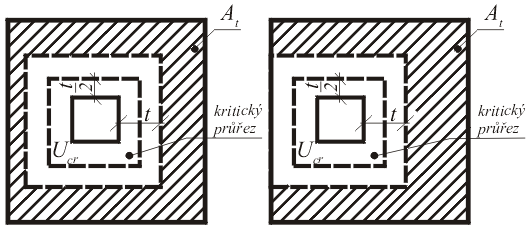 Program umožňuje posoudit patku na protlačení sloupu, popřípadě navrhnout smykovou výztuž. Kritický průřez namáhaný na smyk u je vzdálen od kraje sloupu o polovinu tloušťky patky. Je namáhán zadanými momenty Mx, My a silou Vf, která se vypočte podle vzorce: