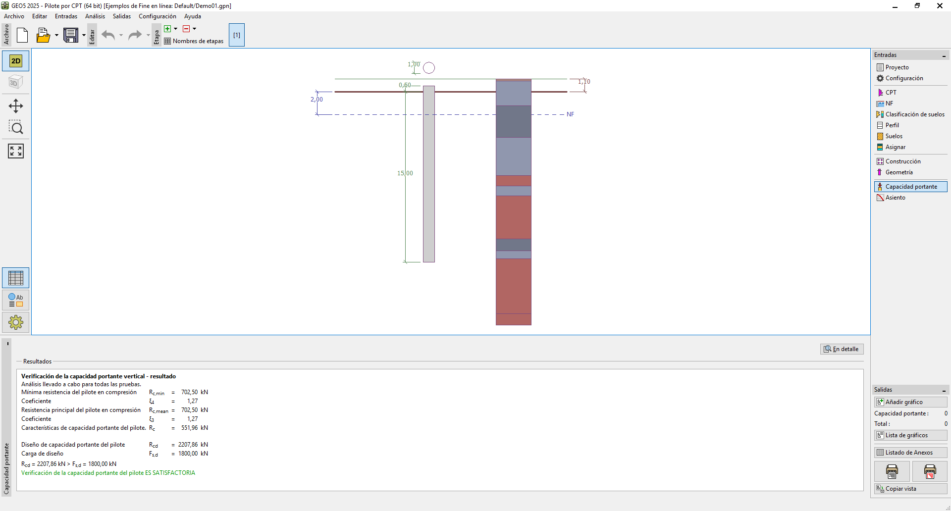 El cuadro "Capacidad Portante" sirve para verificar la capacidad portante vertical. El resultado del análisis se muestra en la parte derecha del fondo del cuadro. El botón "En detalle" abre un cuadro de diálogo con el cual se obtiene un detalle de los resultados del análisis de verificación.