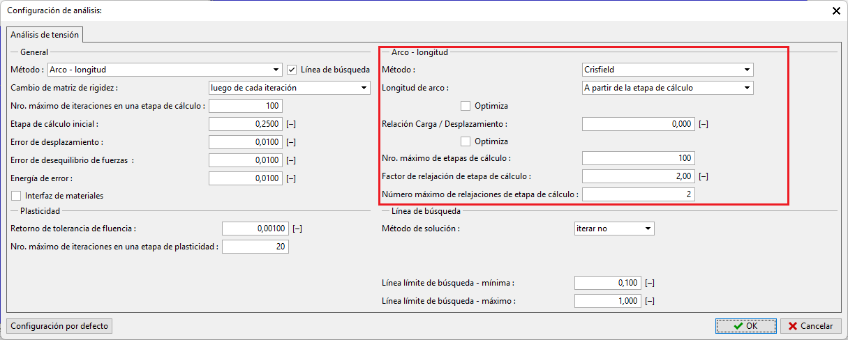 La estrategia de control automático del Arco-longitud, constituye una muy importante parte en la implementación de cualquier método numérico. El programa hace posible ajustes adaptables al arco-longitud actual para nuevas etapas de cálculo dependiendo del curso de iteración en pasos previos por la activación de la opción Optimizar.