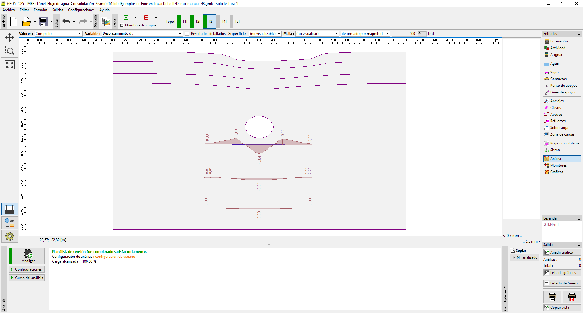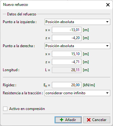 El programa permite incluso, considerar el refuerzo en compresión – por defecto, sin embargo, la parte del refuerzo encontrada en compresión se deshabilita para el análisis. Esta etapa es simulada en la figura mostrando la descripción de la fuerza de tracción normal sobe las partes activas de distintos refuerzos. La parte compresible del refuerzo es temporariamente excluida del análisis. Sin embargo, de forma similar al anclaje, se puede activar automáticamente una vez cargada de nuevo en tensión.